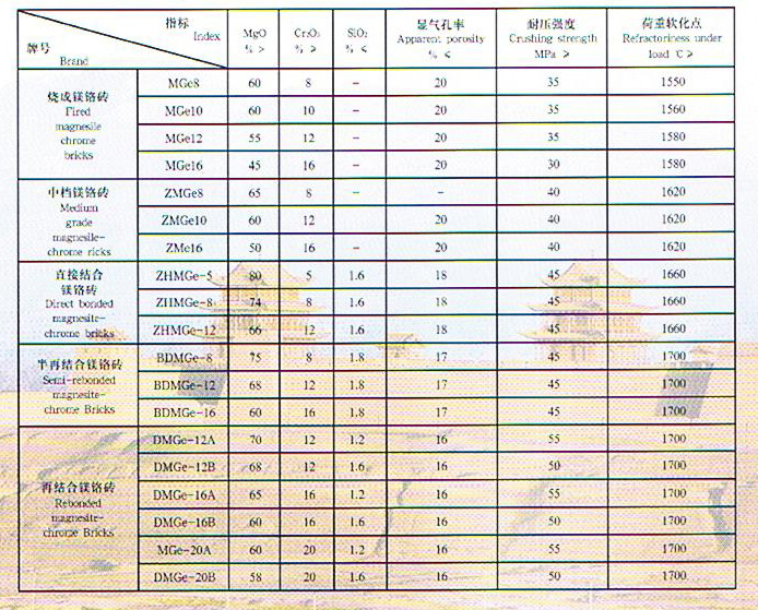 镁铬砖:是以烧结镁砂和氧化铬为原料经高压成型、高温烧成制得,具有热膨胀系数小、抗热震性能好,抗渣性强等特点,广泛用于水泥窑、有色冶金炉、玻璃窑蓄热室等各种工业窑炉。